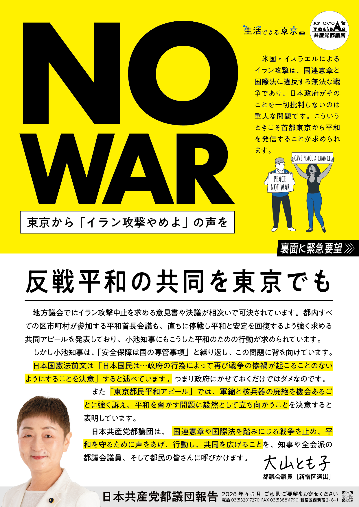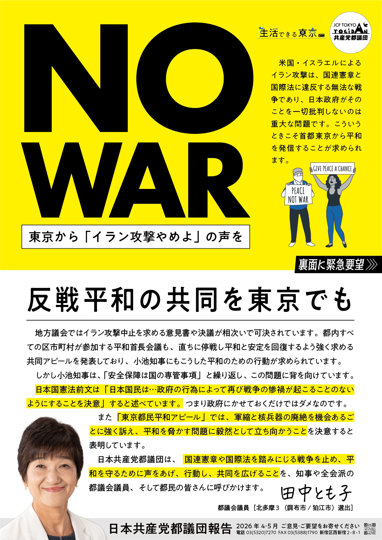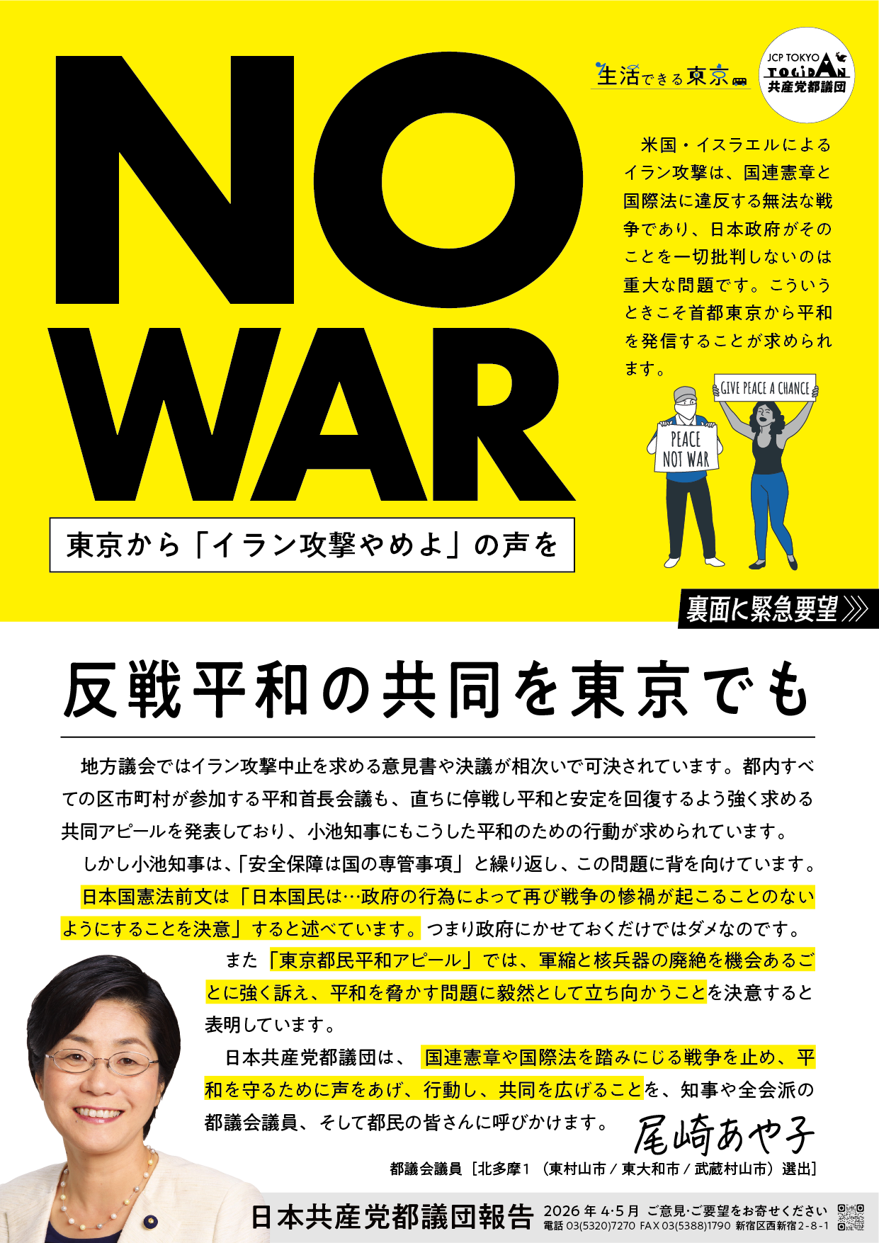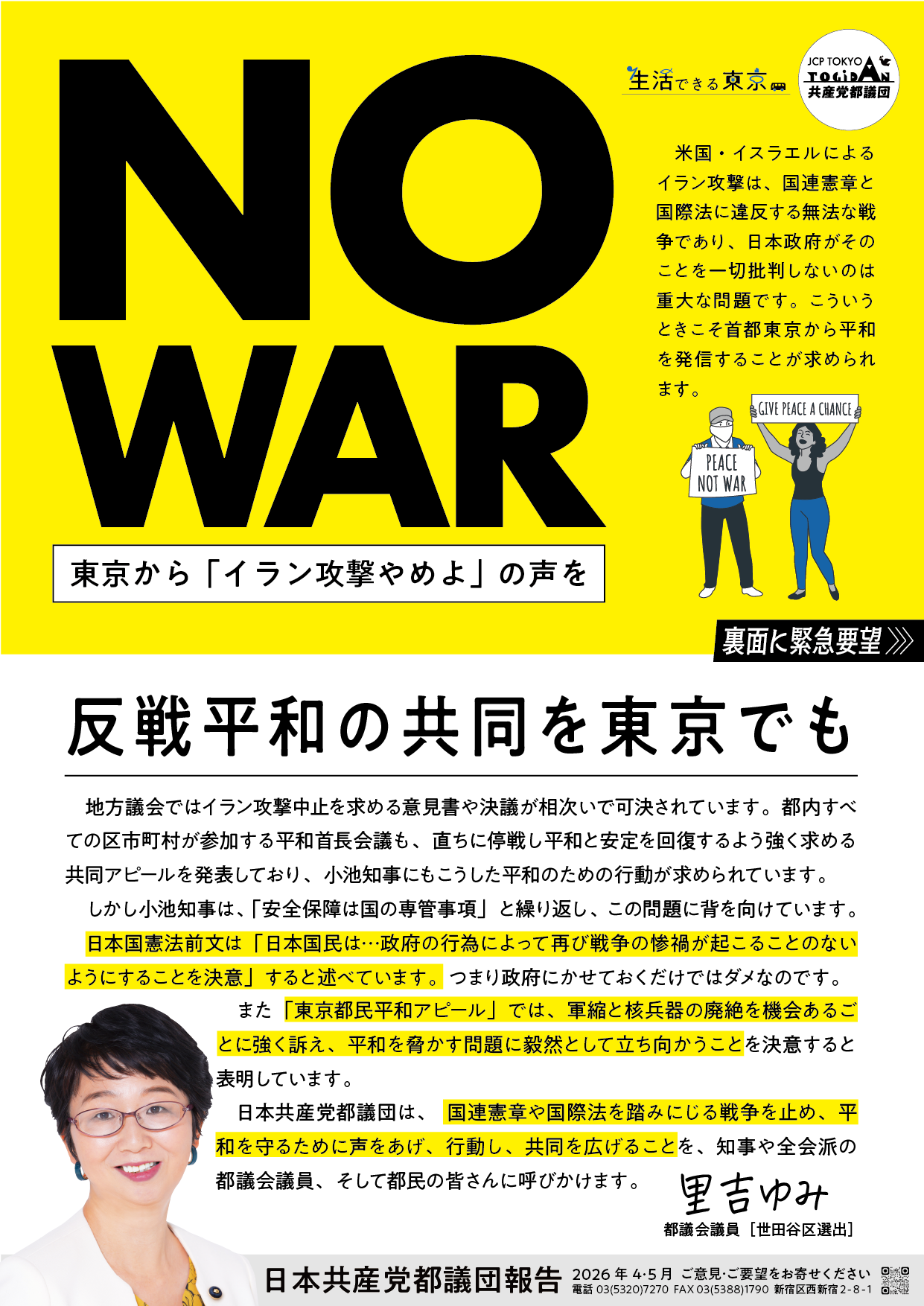都議団報告2026年4月号「東京から『イラン攻撃やめよ』の声を」 全体版 大山とも子版 福手ゆう子版 藤田りょうこ版 里吉ゆみ版 原田あきら版 米倉春奈版 せいの恵子版 竹内愛版 とや英津子版 斉藤まりこ版 清水とし子版 尾崎あや子版 田中とも子版 原のり子版