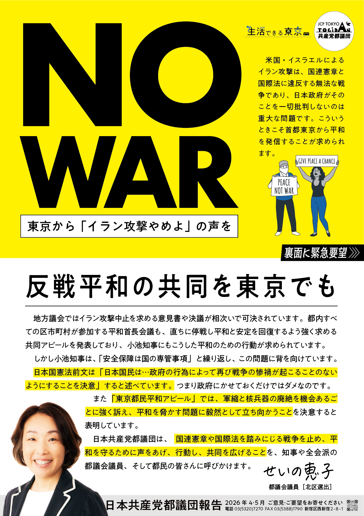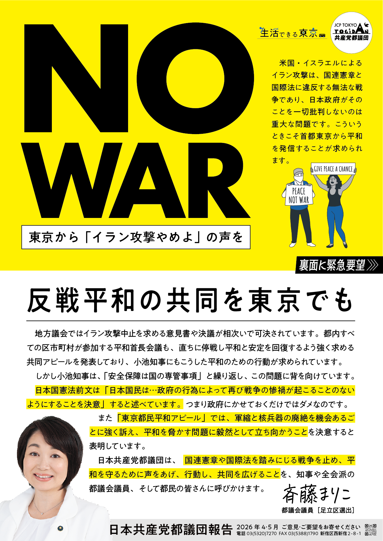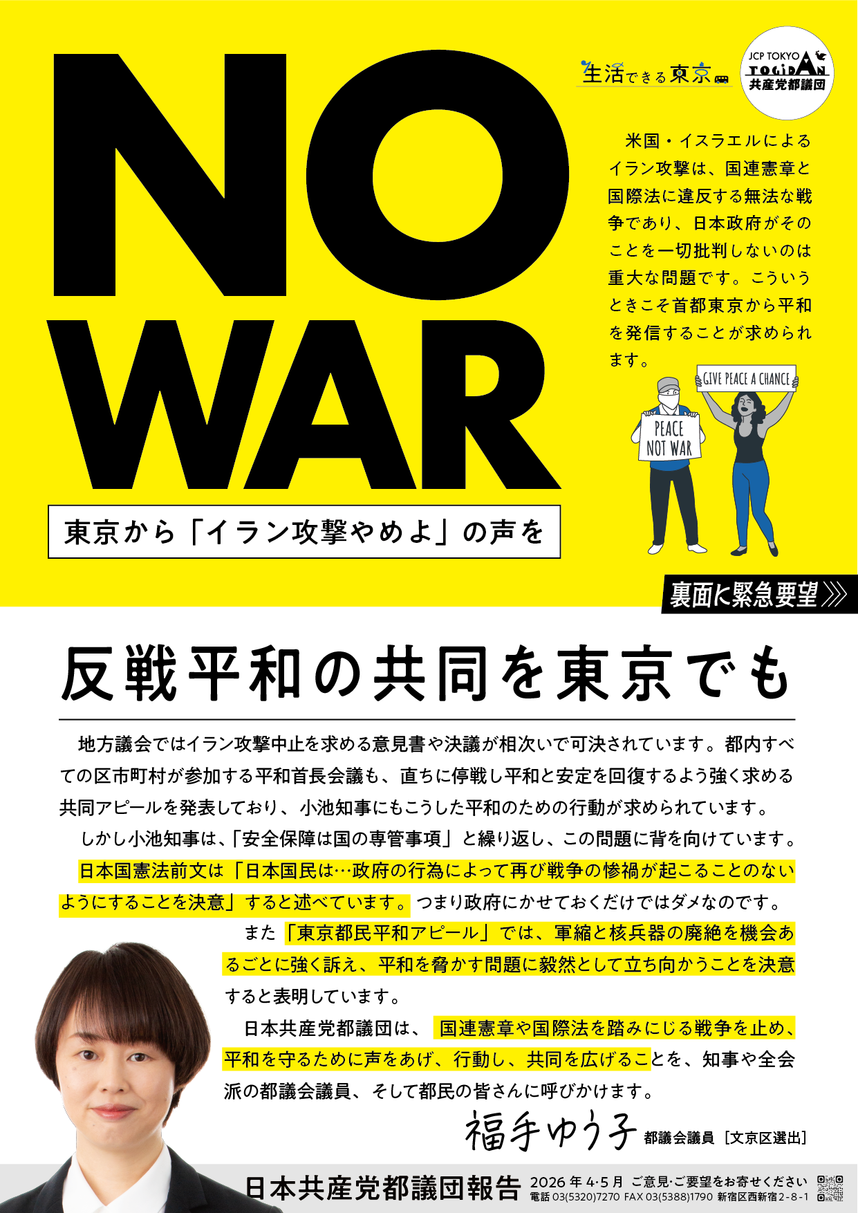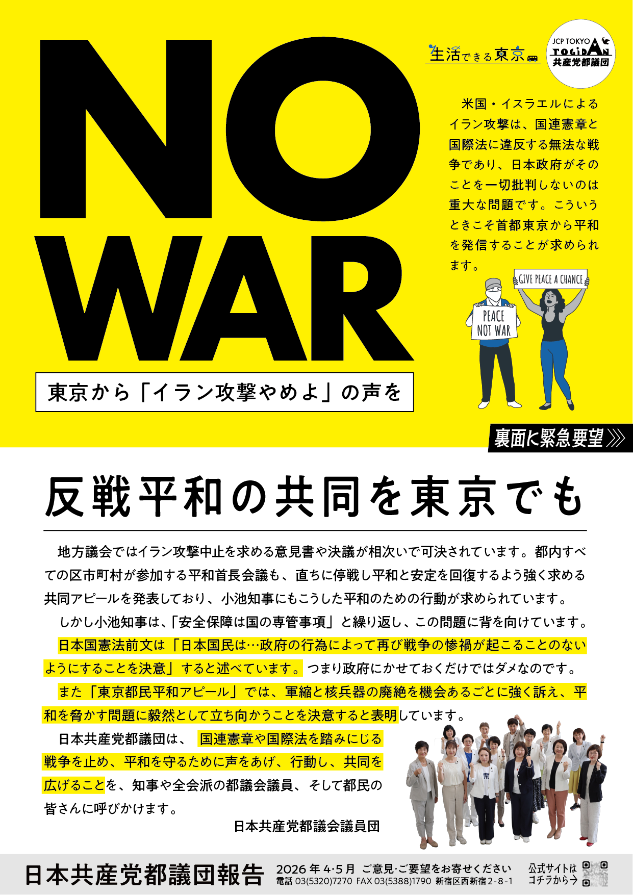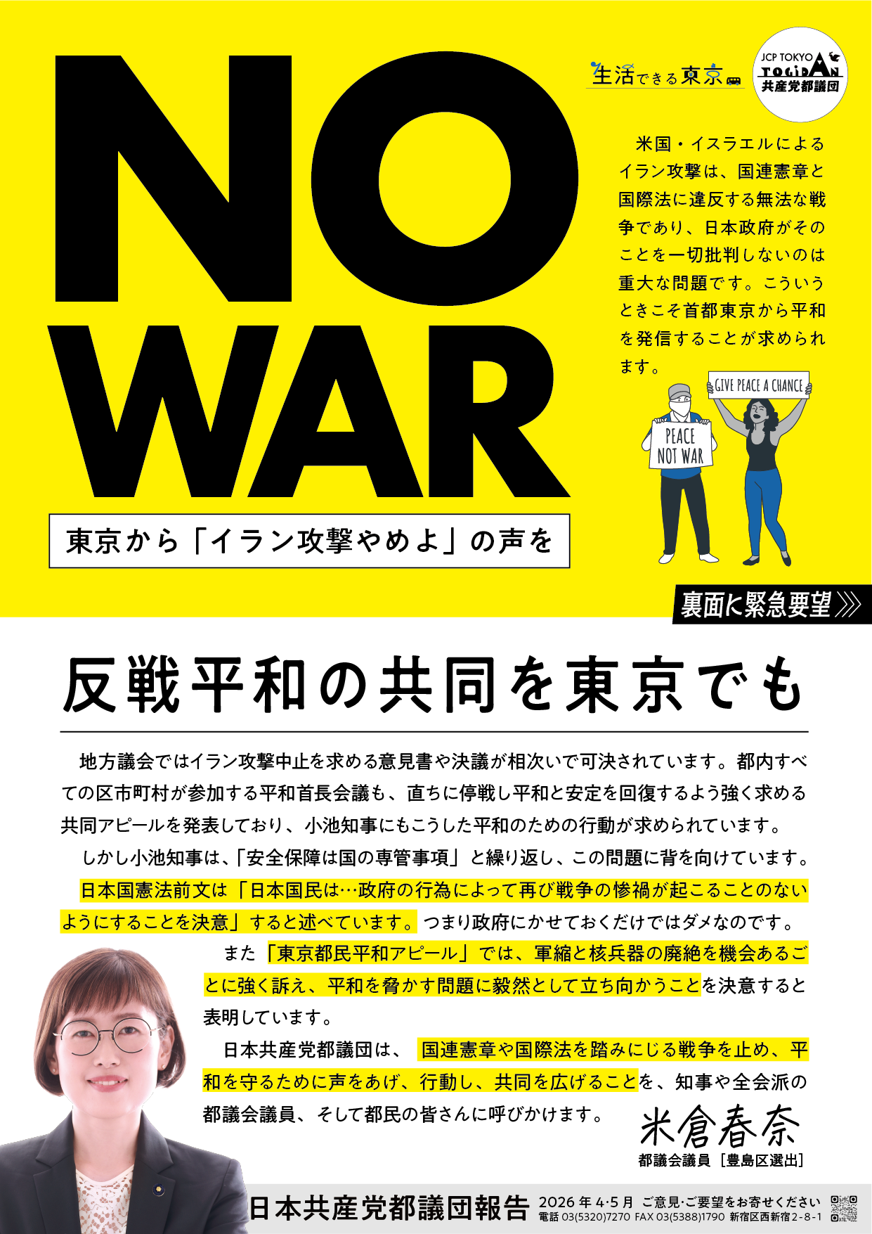 都議団報告2026年4月号「東京から『イラン攻撃やめよ』の声を」 全体版 大山とも子版 福手ゆう子版 藤田りょうこ版 里吉ゆみ版 原田あきら版 米倉春奈版 せいの恵子版 竹内愛版 とや英津子版 斉藤まりこ版 清水とし子版 尾崎あや子版 田中とも子版 原のり子版