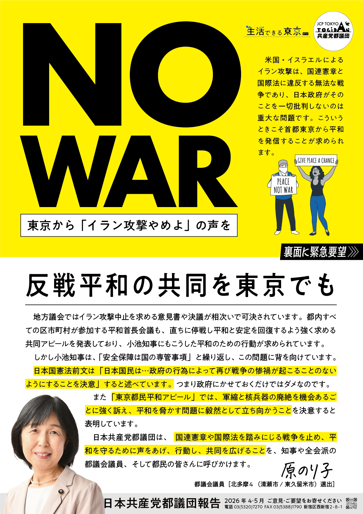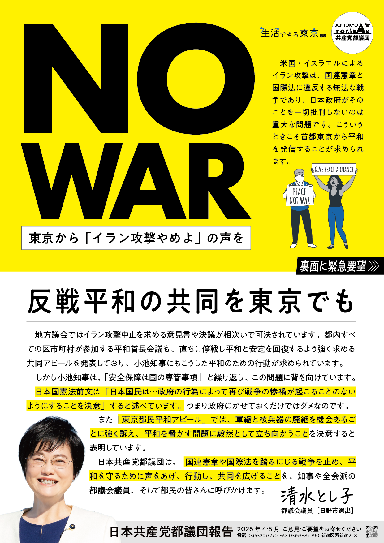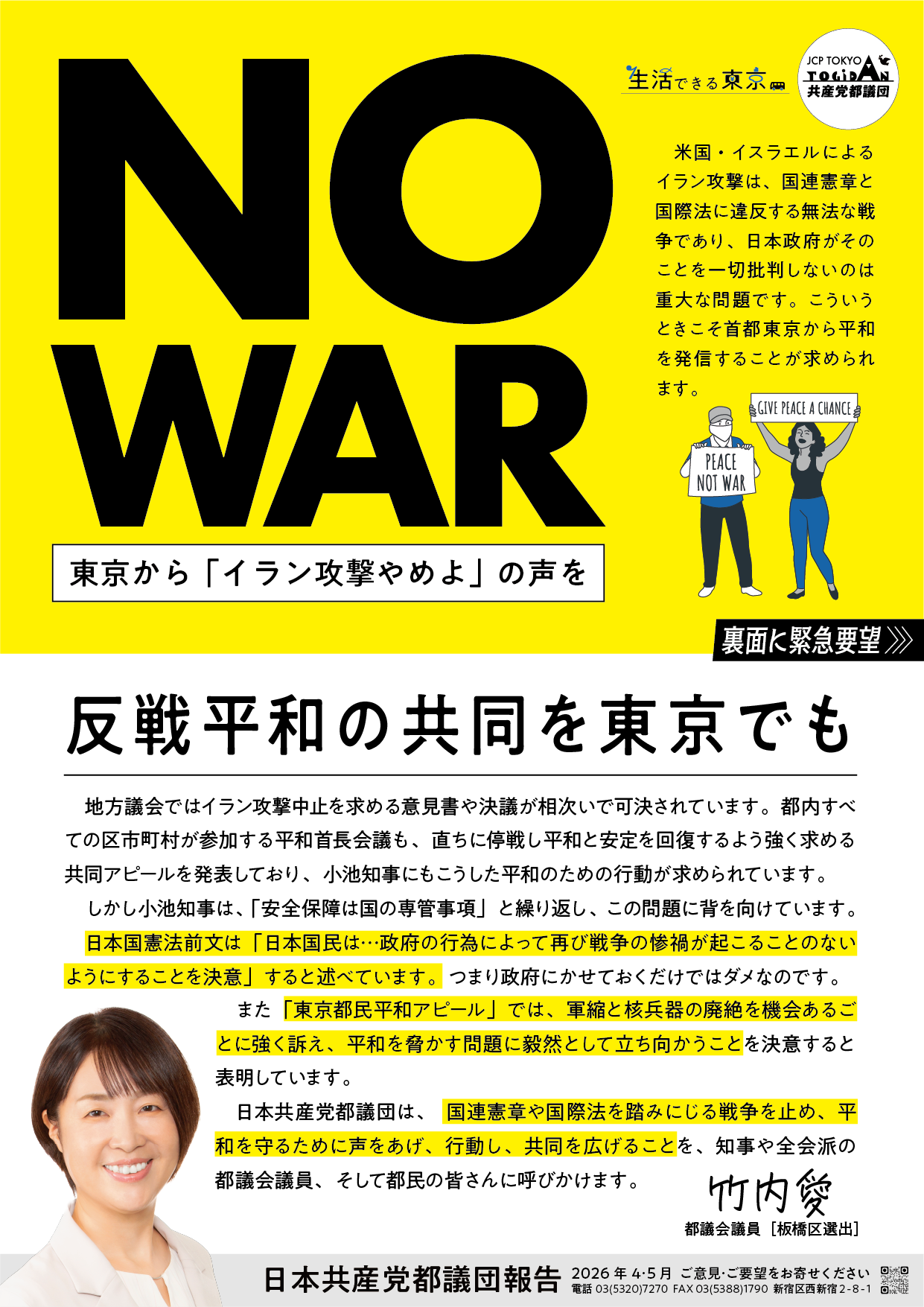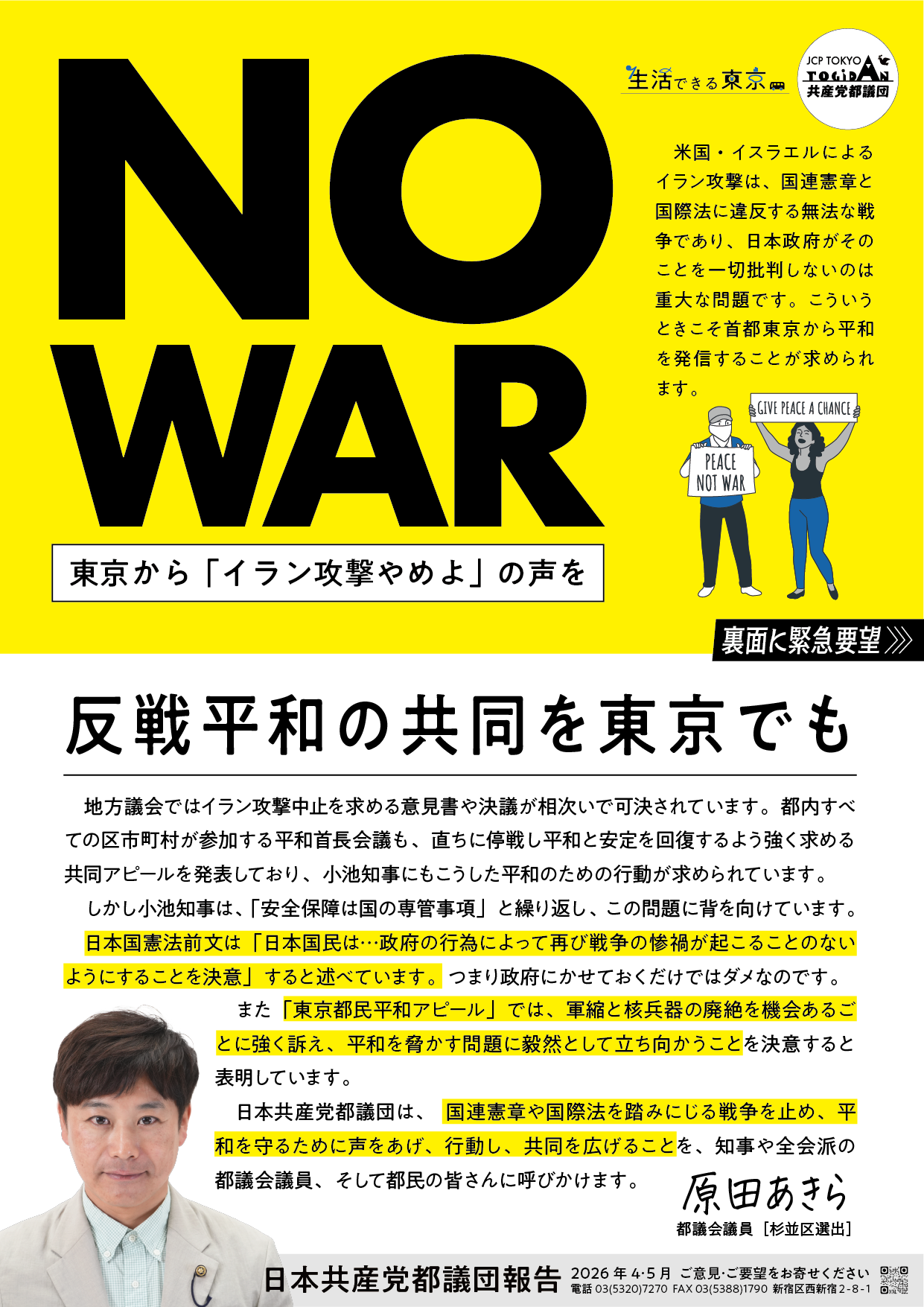 都議団報告2026年4月号「東京から『イラン攻撃やめよ』の声を」 全体版 大山とも子版 福手ゆう子版 藤田りょうこ版 里吉ゆみ版 原田あきら版 米倉春奈版 せいの恵子版 竹内愛版 とや英津子版 斉藤まりこ版 清水とし子版 尾崎あや子版 田中とも子版 原のり子版