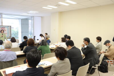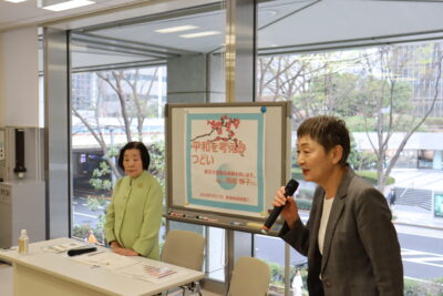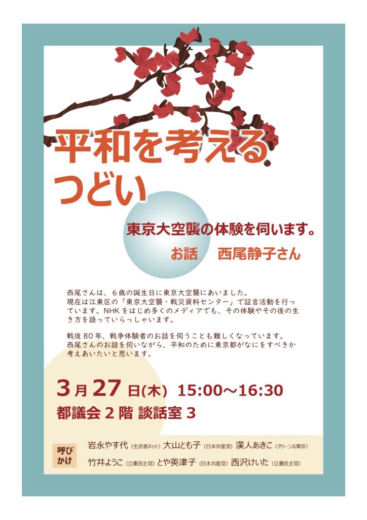 6人の都議が呼びかけ人となった「平和を考えるつどい」が3月27日、都議会内で開催されました。東京大空襲の体験を西尾静子さんから伺いました。日本共産党、立憲民主党、生活者ネット、グリーンな東京、自由を守る会の都議らと市民が参加しました。