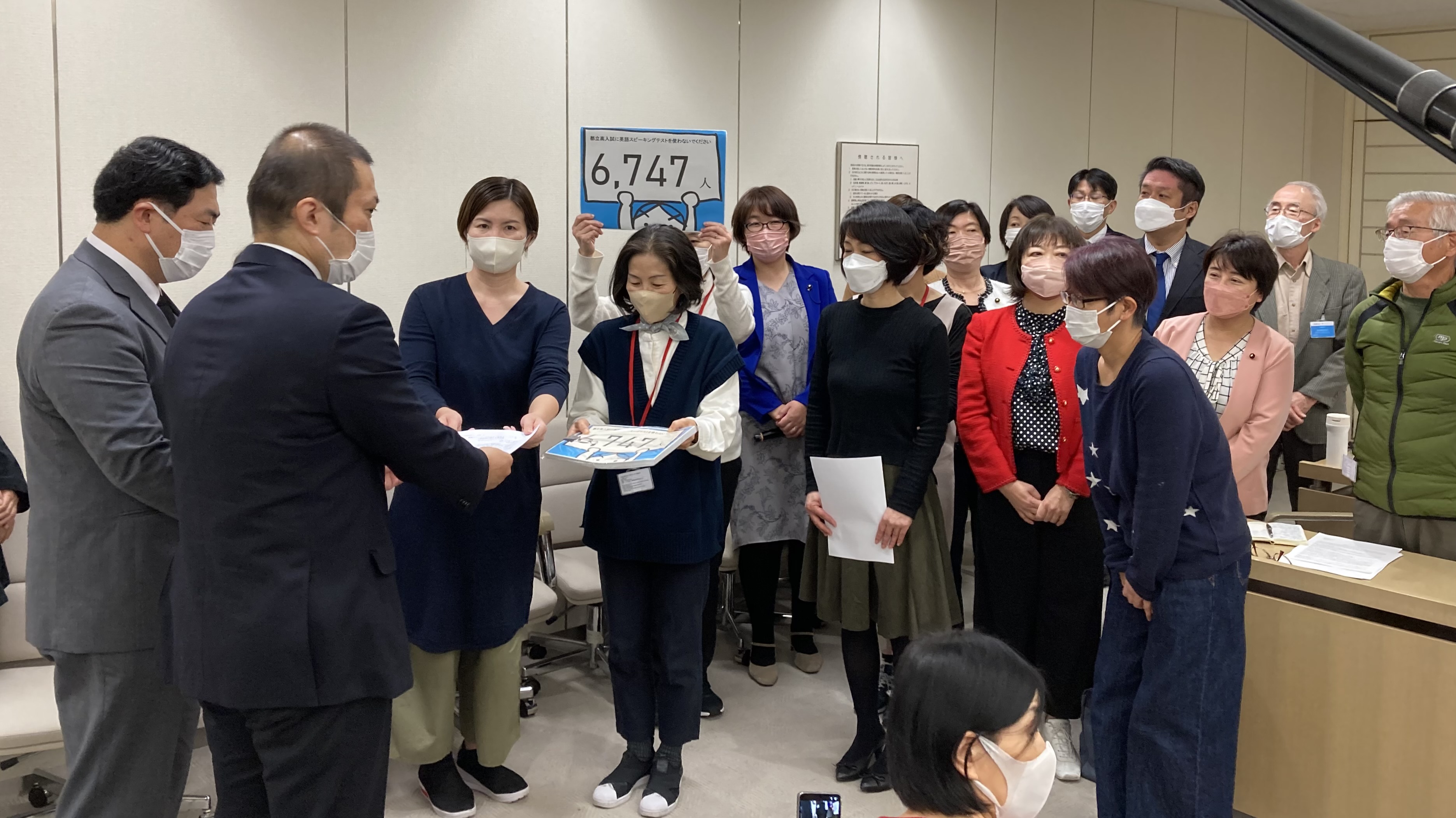 都立高校入試に教育産業大手のベネッセコーポレーションが実施する中学校英語スピーキングテスト(ESAT―J)を使わないよう求めて、四つの市民団体は15日、都教育委員会に対し要請・質問を行いました。主催はESAT―Jの入試活用を中止するための都議会議員連盟。「都立高校入試英語スピーキングテストに反対する保護者の会」は、中学1年生と呼びかけた6747人分の署名を提出しました。