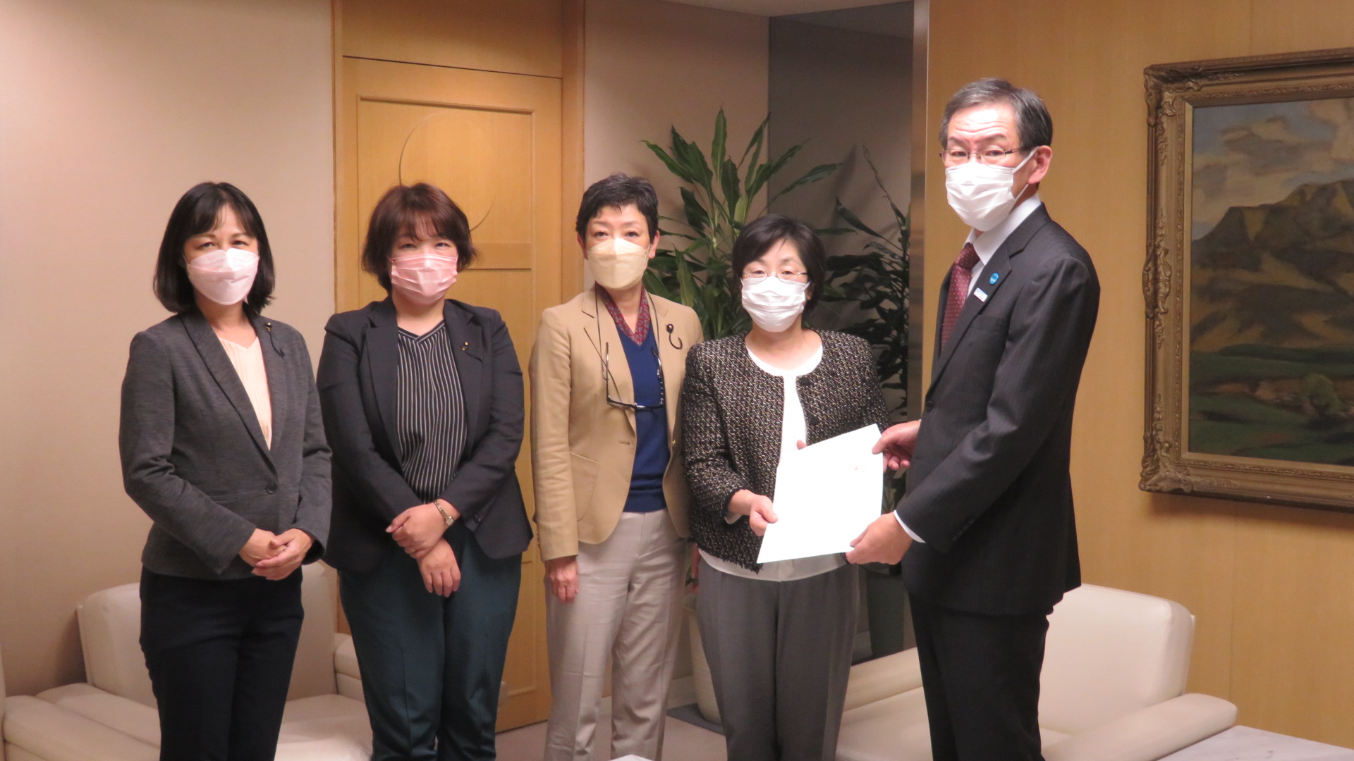 武市副知事に申し入れを手渡す(左から)原純子(江戸川区)、アオヤギ有希子(八王子市)、