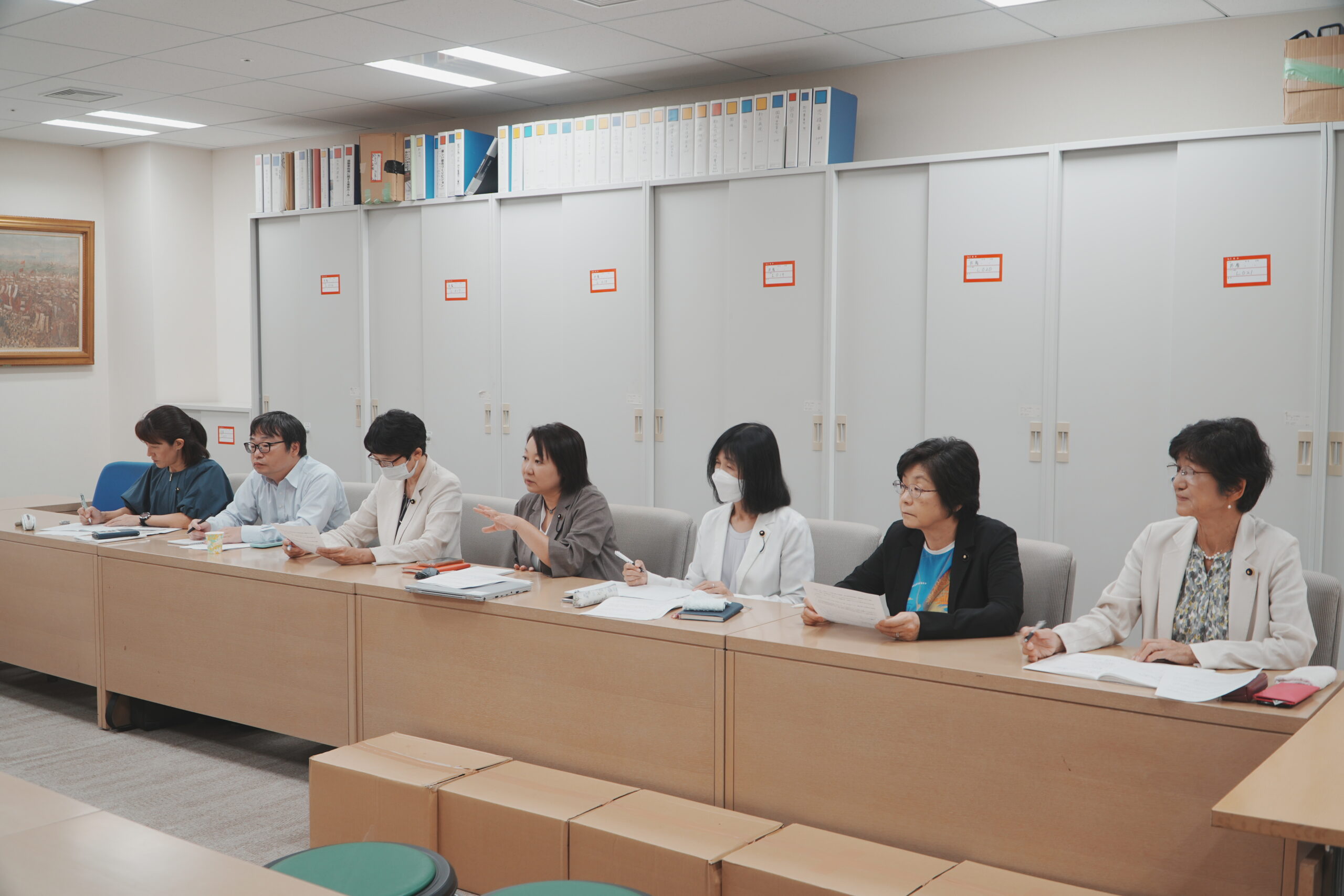 申し入れを行う(左2人目から)斉藤まりこ、里吉ゆみ、川上こういち世田谷区議、藤田りょうこ、原のり子、原田あきら、尾崎あや子、田中とも子の各都議