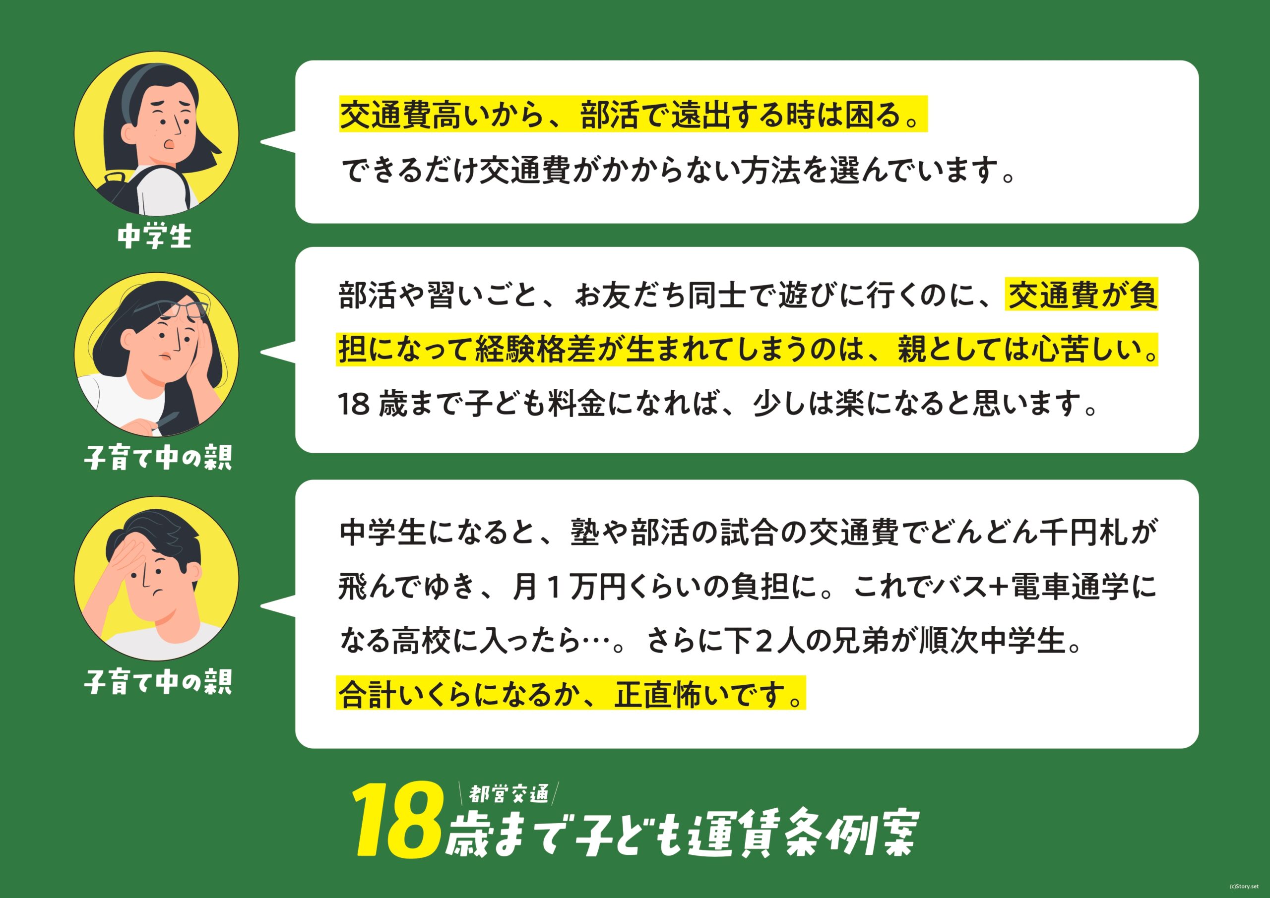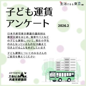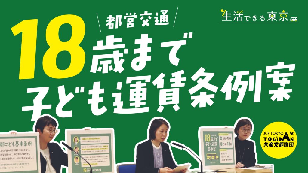「部活の試合や練習試合があるたびに、親に1,000円以上出してもらって悪い気がする」「高校までは頑張って自転車で通学して貰っています」…子どもの交通費の負担に悩む声が数多く寄せられています。日本共産党都議団は昨年1月、「地域公共交通の危機打開・充実への提言」を発表し、バスも鉄道も「小児運賃」の対象年齢を拡大し、6歳から18歳まで運賃半額の「子ども運賃」にすることを提案しました。昨年6月の都議会議員選挙でも、都営交通の子ども料金を18歳まで拡大し、通学定期は半額にすることを公約しました。今回の条例改正提案は、これらの提言や公約の具体化です。