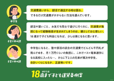 通学、部活の遠征、通塾など、中学生・高校生になれば当然、行動範囲が広がります。そのときに交通費が足かせとなり、子どもたちがのびのびと行動することを妨げられている実態があるということです。子どもたちの成長・発達を保障する政治の責任が問われています。