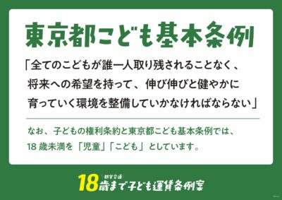 今日、子どもの権利条約、こども基本法、そして東京都こども基本条例では、教育を無償で受ける権利を保障し、文化、芸術、レクリエーション、余暇のための平等な機会を提供し、「全てのこどもが誰一人取り残されることなく、将来への希望を持って、伸び伸びと健やかに育っていく環境を整備していかなければならない」(都こども条例)としています。また、子どもの権利条約と都のこども基本条例では18歳未満を「児童」「こども」としています。84年前の省令の規定では、こうした今日のこども政策の到達点に十分応えることができないことは明らかです。