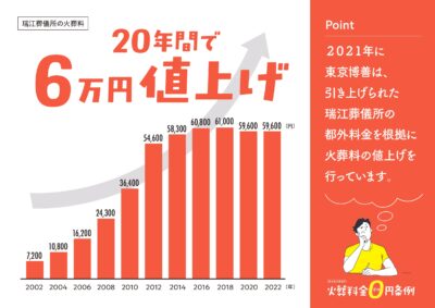 瑞江葬儀所の火葬料は、2002年に7,200円だったものが、受益者負担だとして現在、都民は5万9,600円まで、この20年間で8倍に引き上げられました。2021年に東京博善は、この引き上げられた瑞江葬儀所の都外料金を根拠に火葬料の値上げを行っています(別紙資料7)。